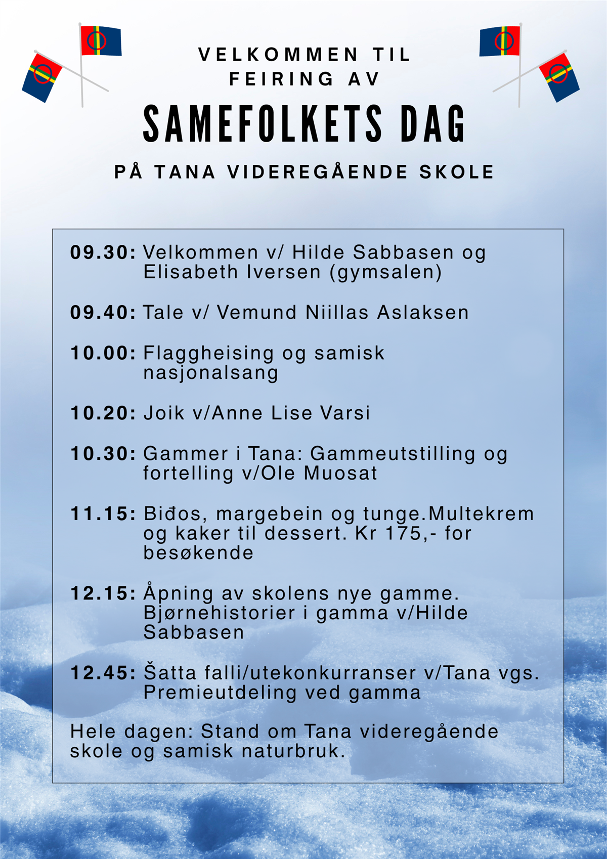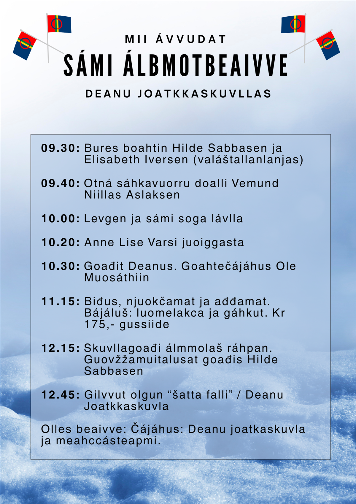 Feiring av samefolketsdagVi feirer samefolketsdag fredag 6. februar. Vi håper naboer og bygdas folk vil komme å feire dagen sammen med oss. Publisert 03.02.2026 17.10 Sist endret 03.02.2026 17.11